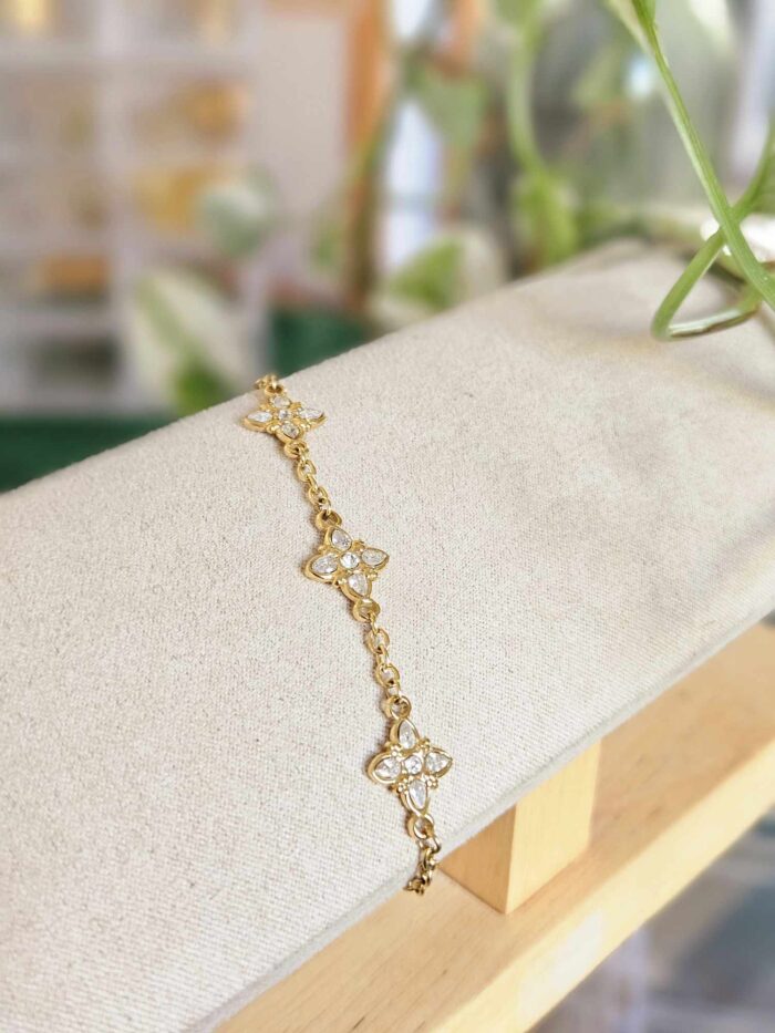 Le bracelet Eyden, se compose d’une fine chaîne dorée ornée de trois charm’s en forme de fleurs.